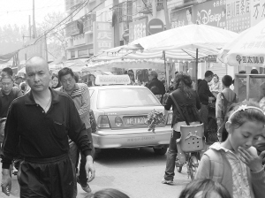 記者在育新街與六一路交叉口看到,路口的許多商販都把商品直接擺放在行車道上,有人站在街上與小販討價還價,自行車、電動車就橫七豎八地停在馬路上。站在路口往南看,高懸的禁行標(biāo)志下,剛好停了一輛綠色的出租車,本來就不寬的馬路被占去一半。