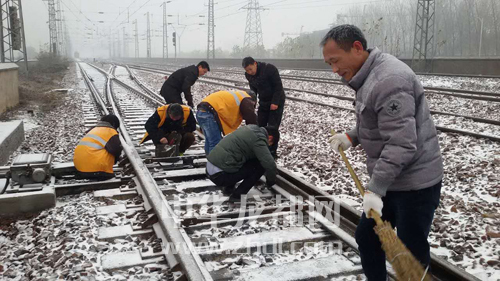 ????11月24日,我市迎來今冬第一場雪。為確保鐵路行車安全,漯阜鐵路有限責任公司組建黨團員突擊隊清掃道岔積雪,涂油、噴灑防凍液,確保設(shè)備正常運轉(zhuǎn),同時在客運站臺鋪設(shè)地毯、防滑墊等,防止旅客摔傷。圖為突擊隊隊員清掃道岔積雪。