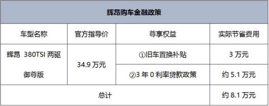 ????????目前購買輝昂,可享受首付30%,三年零利率的金融政策,同時還可以享受3萬元置換補貼或者1萬元保險補貼,詳情請見下表: