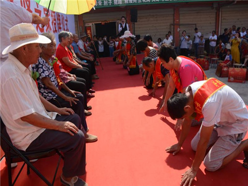 鄉(xiāng)長(zhǎng)吳國(guó)鋒發(fā)表了熱情洋溢的致辭。他首先代表平店鄉(xiāng)黨委、政府、人大向受到表彰的先進(jìn)模范和先進(jìn)家庭表示熱烈的祝賀并致以崇高的敬意。并詳細(xì)闡述了開展“孝善敬老讓愛回家、孝賢之星表彰授牌暨解決獨(dú)居老年人問題、助力脫貧攻堅(jiān)的重大意義,他希望受到表彰的先進(jìn)代表和家庭要珍惜榮譽(yù)、再接再厲,繼續(xù)弘揚(yáng)尊老、敬老、養(yǎng)老、愛老的傳統(tǒng)美德,推動(dòng)全鄉(xiāng)“孝善敬老”文化不斷邁向新臺(tái)階?;顒?dòng)現(xiàn)場(chǎng)宣讀了《平店鄉(xiāng)人民政府敦促將被贍養(yǎng)人接入安全住房共同生活的通告》;與會(huì)領(lǐng)導(dǎo)為孝賢之家頒獎(jiǎng)授牌;28個(gè)“孝子孝媳”在臺(tái)上統(tǒng)一施行叩拜大禮;活動(dòng)結(jié)束后,鄉(xiāng)政府指派3名班子領(lǐng)導(dǎo)和10多名工作人員,分別乘坐6臺(tái)輛,由嗩吶隊(duì)開路,風(fēng)風(fēng)光光把28個(gè)老人送回了家。一路引來不少群眾駐足注目觀看,廣大群眾對(duì)此嘖嘖稱贊、拍手稱快。