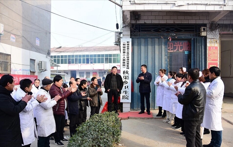 在秋渠鄉(xiāng)衛(wèi)生院,晉繼忠與秋渠鄉(xiāng)黨委負責人梁輝為鄲城縣第三醫(yī)療健康服務集團(鄲城縣第二人民醫(yī)院)秋渠鄉(xiāng)衛(wèi)生院揭牌。