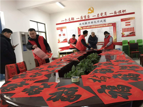 臨近新春佳節(jié),淮陽縣多家單位邀請書法家深入結(jié)對幫扶村開展新春送"福"到農(nóng)家送春聯(lián)活動,一幅幅春聯(lián)翰墨飄香,讓群眾贊不絕口,一幅幅春聯(lián)送去新春的祝福,讓原本寒風(fēng)凌冽的冬日變得溫馨、喜慶。圖為縣住建局組織書法愛好志愿者在朱集鄉(xiāng)南陳樓開展送春聯(lián)活動,志愿者現(xiàn)場揮毫潑墨,書寫新春對聯(lián),受到廣大群眾的歡迎。