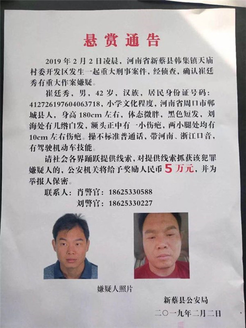 2月2日凌晨,駐馬店新蔡縣韓集鎮(zhèn)發(fā)生一起重大刑事案件,犯罪嫌疑人崔某因懷疑其妻子與受害人楊某有不正當關(guān)系,午夜駕車沖進受害人楊某的居住地放火將其殺害,犯罪嫌疑人崔某趁夜色潛逃。新蔡縣公安局黨委啟動重大刑事案件偵破機制,緊急發(fā)布公安協(xié)查通報,請求兄弟單位協(xié)助抓捕。并發(fā)布懸賞通告,懸賞5萬元通緝崔某。結(jié)合犯罪嫌疑人崔某可能逃跑路線,新蔡警方先后輾轉(zhuǎn)溫州、青島、臨泉、周口等地開展抓捕工作,均未果。