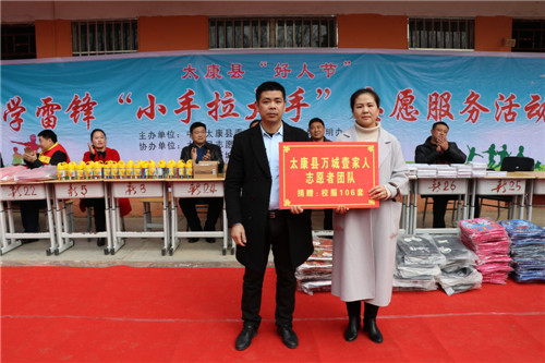 上午9時10分,隨著兩名小主持人婁婷涵和許家輝走上舞臺,太康縣“好人節(jié)”暨學(xué)雷鋒“小手拉大手”志愿服務(wù)活動”活動正式拉開序幕。舞臺上,精彩的武術(shù)表演、優(yōu)美的歌曲、舞蹈、動人的勵志手語舞等節(jié)目,讓觀眾大飽眼福,贊嘆不已。同時,該縣萬城壹家人團(tuán)隊還為新店鋪小學(xué)的學(xué)生們帶來了106套、價值2萬余元的新校服,以及多套組合衣柜。