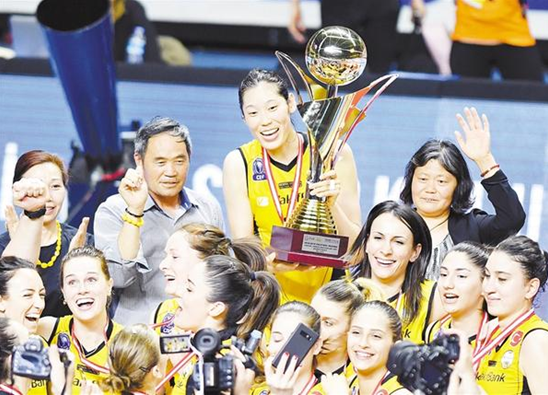 5月5日,瓦基弗銀行隊(duì)球員朱婷(中上)邀請父母進(jìn)入球場慶祝奪冠。 當(dāng)日,在2018-2019賽季土耳其女排超級(jí)聯(lián)賽決賽第五回合比賽中,瓦基弗銀行隊(duì)客場以3比0戰(zhàn)勝伊薩奇巴希隊(duì),以總比分3比2成功衛(wèi)冕聯(lián)賽冠軍。朱婷也蟬聯(lián)了聯(lián)賽MVP(最有價(jià)值球員)稱號(hào)。 新華社記者 徐速繪 攝