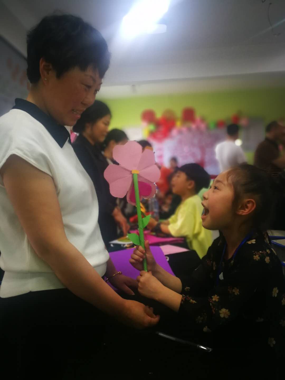 活動(dòng)上,在專(zhuān)業(yè)手工教師的指導(dǎo)以及媽媽的配合下,這些小記者自己動(dòng)手利用剪刀、雙面膠、彩紙等學(xué)習(xí)制做康乃馨紙花。五層紅色的花瓣、兩片綠葉、一根花枝,經(jīng)過(guò)近一個(gè)小時(shí)的反復(fù)實(shí)踐,一朵朵紙花陸續(xù)制好,成功的喜悅映紅了孩子們的笑臉。在祝??ㄆ蠈?xiě)下對(duì)媽媽的祝福語(yǔ)后,孩子們手捧用彩紙包裝好的紙花,拿著祝??ㄋ偷侥赣H手中,和媽媽熱情擁抱、向媽媽表達(dá)愛(ài)的祝福。