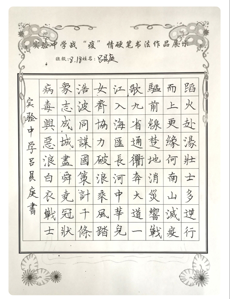 “赴湯蹈火壯士多,逆行而上更緣何。南山滅疫驅(qū)前線,楚地消災(zāi)響戰(zhàn)歌。九省通衢奔大道,一江入海匯長河。中華兒女齊協(xié)力,破浪乘風踏浩波......”扶溝縣實驗中學“萬眾一心 抗擊新冠”硬筆書法比賽中,八(18)班呂艮庭同學鄭重地抄錄了這首律詩。
