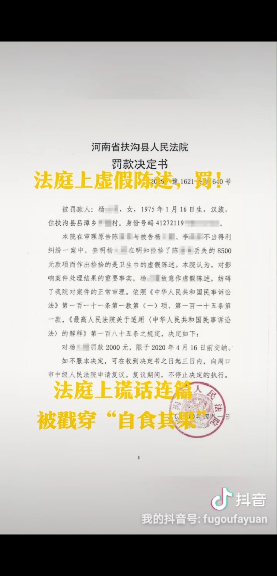 為了將撿到的8500元錢據(jù)為己有,當事人竟然在法庭上作出虛假陳述,最終不僅被法官當庭識破,全額返還失主,還被法院處以2000元罰款,真可謂得不償失、自食苦果。近日,針對被告楊某的虛假陳述行為,扶溝縣人民法院呂潭法庭依法作出罰款2000元的處罰決定,楊某在規(guī)定時間內(nèi)繳清了罰款。