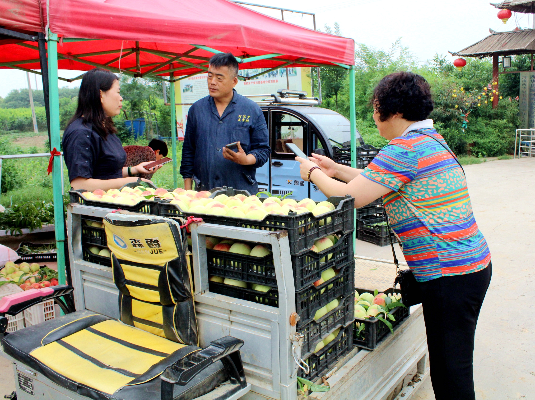 桃子成熟期,“桃子哥”通過(guò)微信群、抖音、快手、拼多多等網(wǎng)上宣傳,每天接單100多個(gè),忙得應(yīng)接不暇。如今,在黃橋鄉(xiāng)萬(wàn)畝桃園附近村莊,像“桃子哥”一樣通過(guò)微信群、短視頻直播宣傳萬(wàn)畝桃園、賣(mài)水蜜桃的桃農(nóng)日益增多。