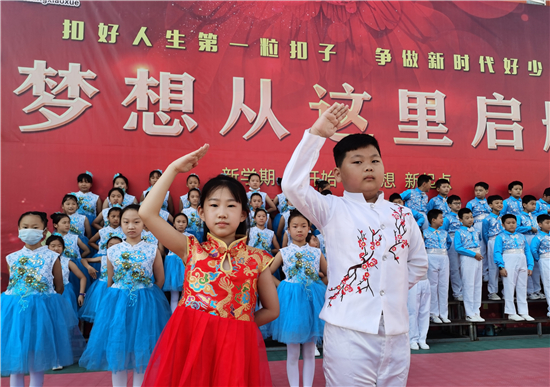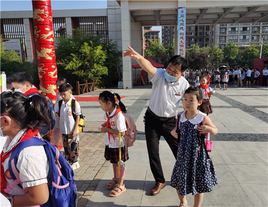 9月7日早上,周口市文昌小學(xué)的學(xué)生有序排隊(duì)測量體溫后進(jìn)入學(xué)校。據(jù)文昌小學(xué)校長介紹,全市中小學(xué)實(shí)行錯峰開學(xué)。今天是小學(xué)開學(xué)時間,文昌小學(xué)學(xué)生每個年級實(shí)行錯時上下學(xué),學(xué)生入校要測體溫,并為一年級新生舉辦了主題為“夢從這里啟航”的“迎新儀式”。