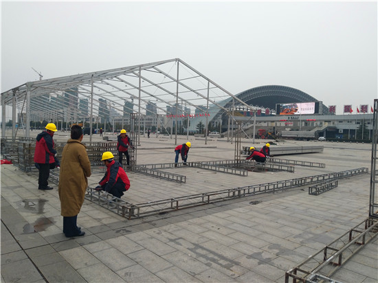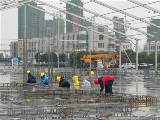 為迎接11月28日至30日舉辦的周商產(chǎn)品展示展覽活動(dòng),現(xiàn)場(chǎng)70余名施工人員不顧天氣惡劣,抓緊搶干工期,爭取在11月25日全面搭建完畢。