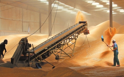 許昌市建安區(qū)陳曹鄉(xiāng)雙廟村金豐公社農(nóng)業(yè)服務(wù)有限公司,工作人員在糧倉中整理剛剛?cè)霂斓男←?。資料圖片