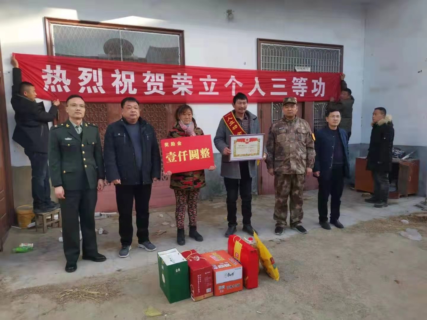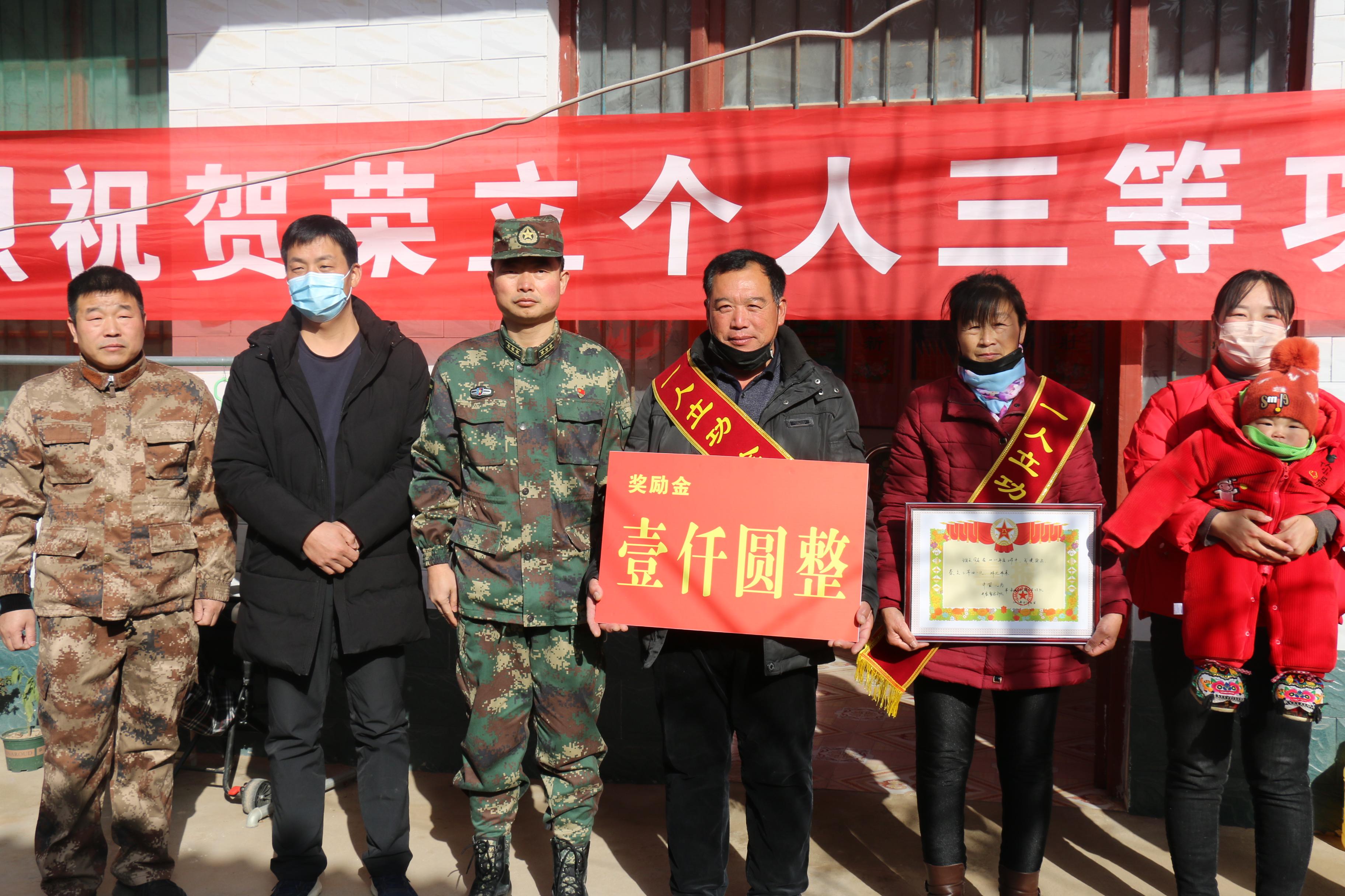 1月12日上午,西華縣西華營鎮(zhèn)雙樓村某部士官高志豪家中鑼鼓喧天,喜氣洋洋。該縣人武部政委涂友佳、縣退役軍人事務(wù)局局長龔坤敬一起把二等功喜報(bào)和“一人立功,全家光榮”的紅色綬帶及5000元現(xiàn)金等送到高志豪及其父母手中。