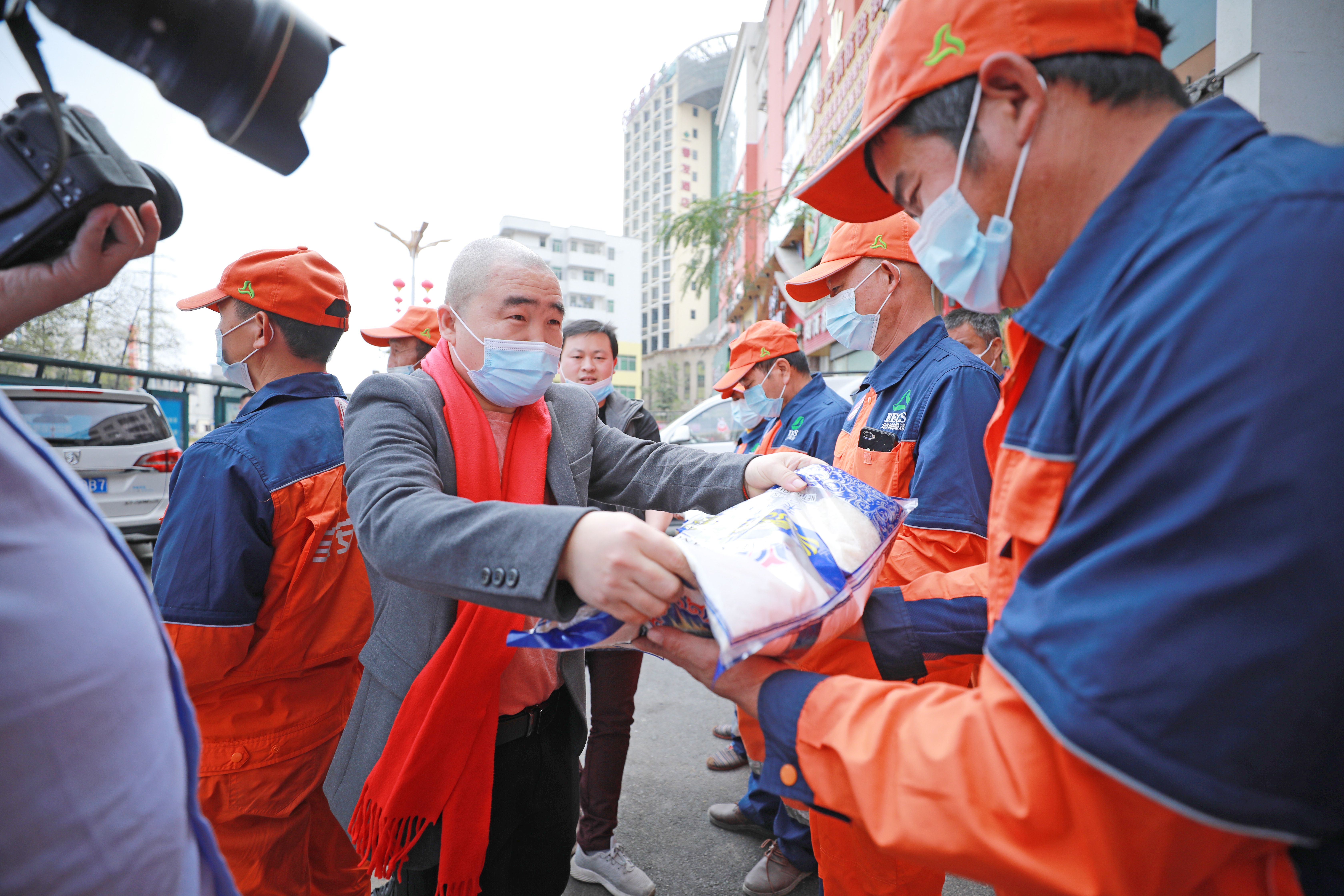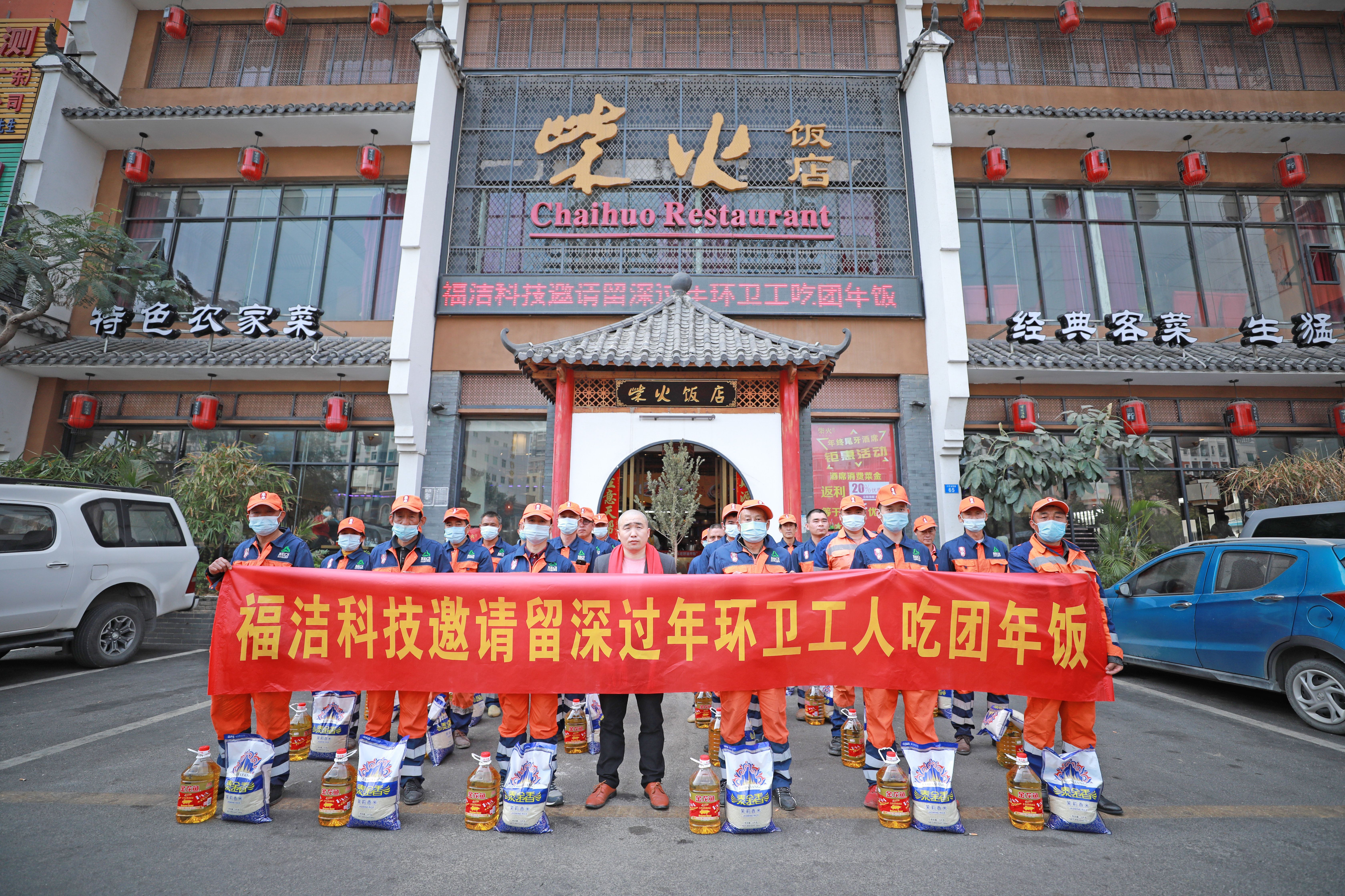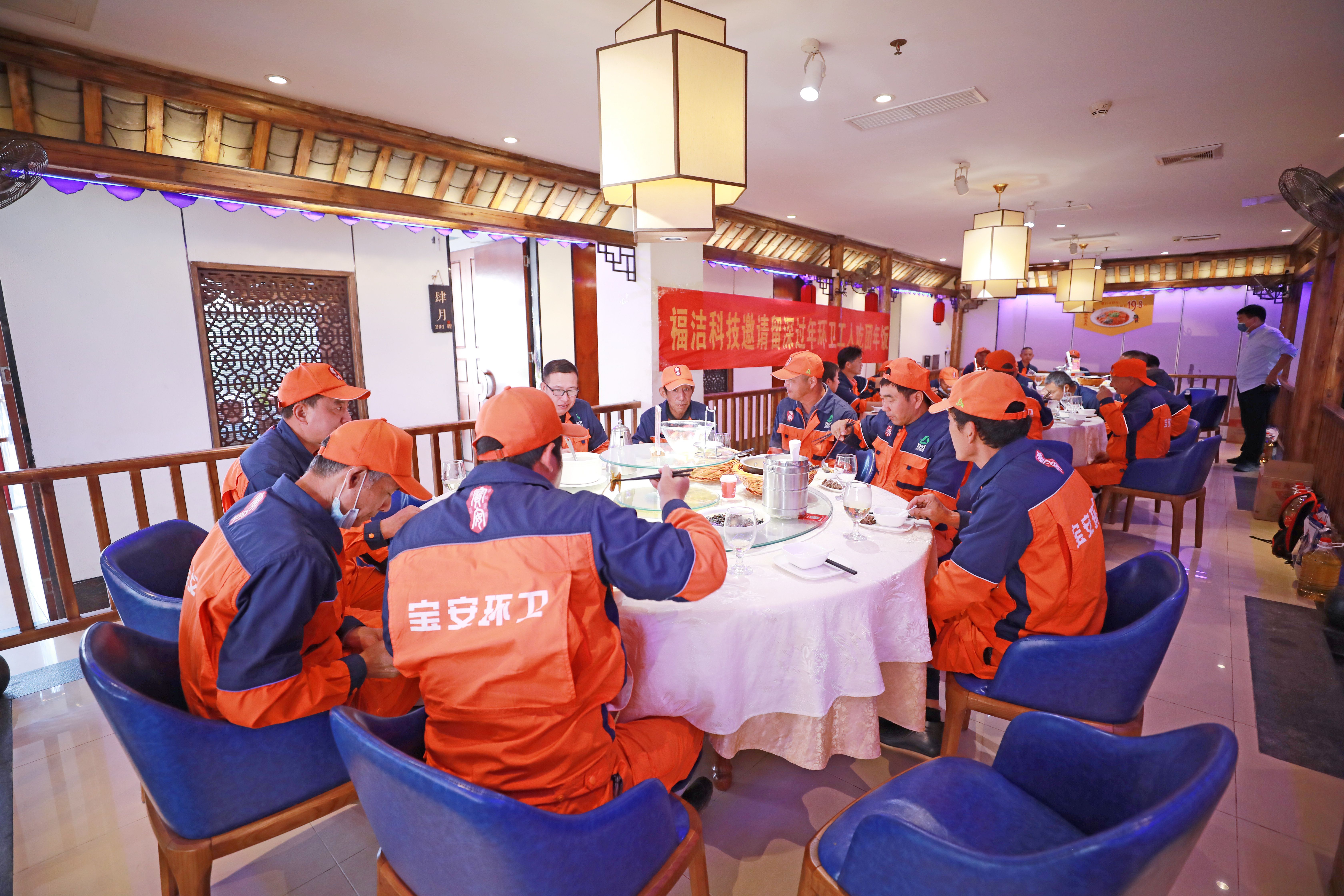 “今年過年我們都留在深圳了,張老板很有愛心,經(jīng)常關(guān)照我們環(huán)衛(wèi)工,很感謝他!”1月27日中午,在深圳寶安區(qū)新橋街道北環(huán)路柴火飯店,近30名(大部分為河南籍)留深過年的環(huán)衛(wèi)工在一起吃團(tuán)年飯,菜肴飄香,其樂融融。做東的是深圳市福潔科技公司的老板張高鵬。當(dāng)日中午,環(huán)衛(wèi)工們剛結(jié)束上午的工作,身穿工作服走進(jìn)深圳寶安區(qū)新橋街道柴火飯店。愛心老板張高鵬在門口迎接,并為大家送上大米、金龍魚油和新年祝福。白切雞、龍骨靚湯、小炒肉、紅燒肉、紅燒鯉魚、梅菜扣肉……餐桌上擺滿了各式菜肴,供環(huán)衛(wèi)工人們享用。大家一邊品嘗美味,一邊拉起家常。