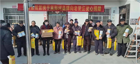 “這是在安徽金搖藍(lán)公司工作的老官莊村人王北領(lǐng)、王建立攜手萊那珂奶粉企業(yè)慰問鄉(xiāng)親們吶!”武金英老人一臉幸福。據(jù)悉,這次慰問的對(duì)象是老官莊貧困戶、60歲以上老人及困難群眾,慰問捐贈(zèng)的禮品為奶粉240桶,價(jià)值十萬(wàn)余元。同時(shí),老官莊新當(dāng)選地村黨支部書記王杰華也出資5000元,為村里的60歲以上老人及困難群眾購(gòu)買大米120袋,用行動(dòng)為老官莊老人送去節(jié)日的祝福。