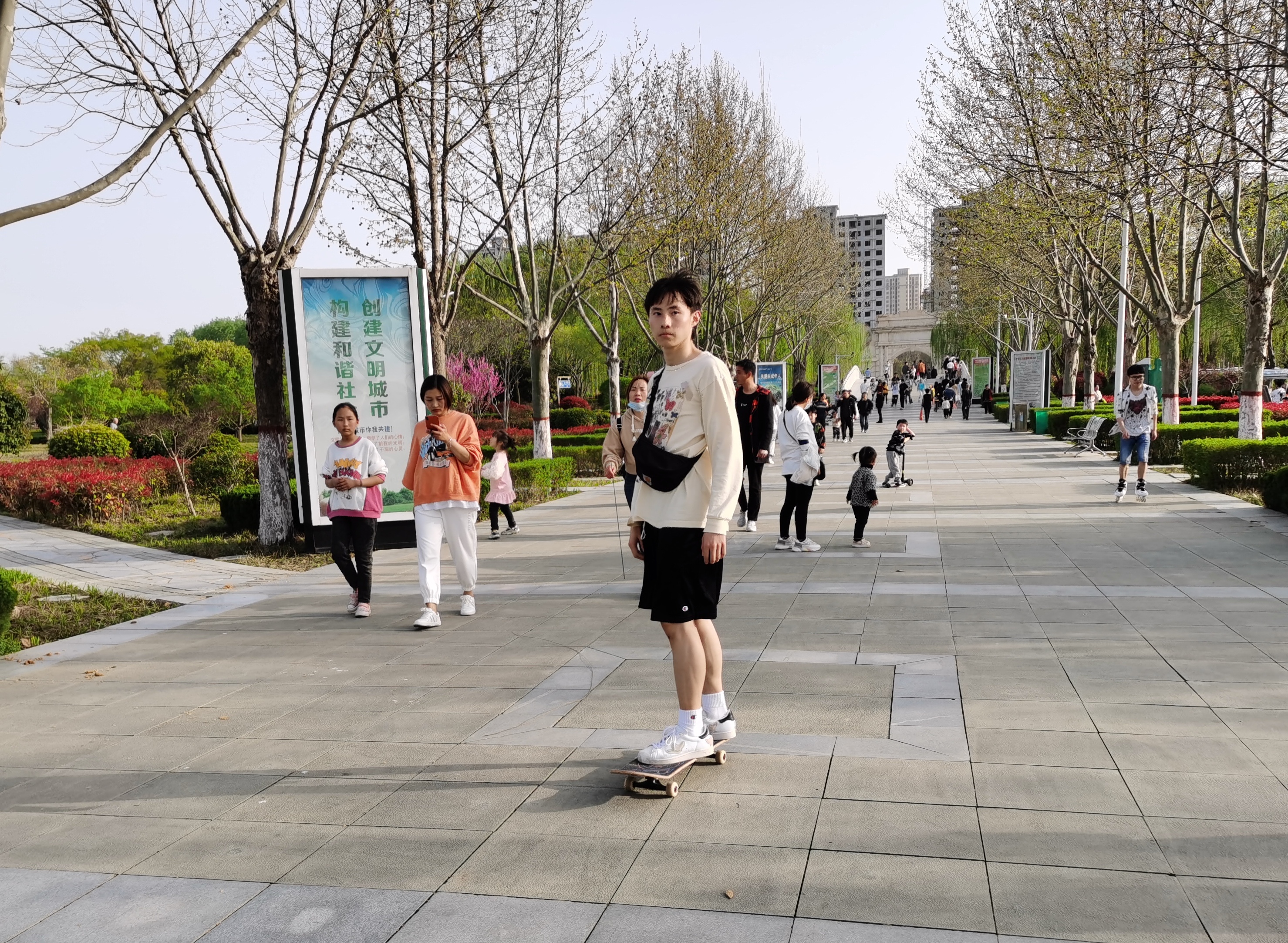 3月28日,周口市天氣晴好,氣溫也攀升至近期的最高溫度(25度),市民脫下厚重的冬衣 ,紛紛換上了輕薄的服裝。記者在公園和街頭看到,出行的市民中,不少時(shí)髦的年輕人換上了短褲和半袖。①5