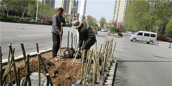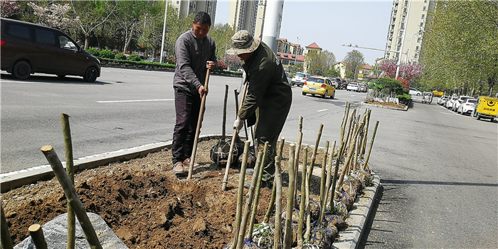 仲春時(shí)節(jié),我市積極打造街頭游園、口袋公園,增加市民休閑游樂場(chǎng)所。圖為園林工人正在施工。②7
