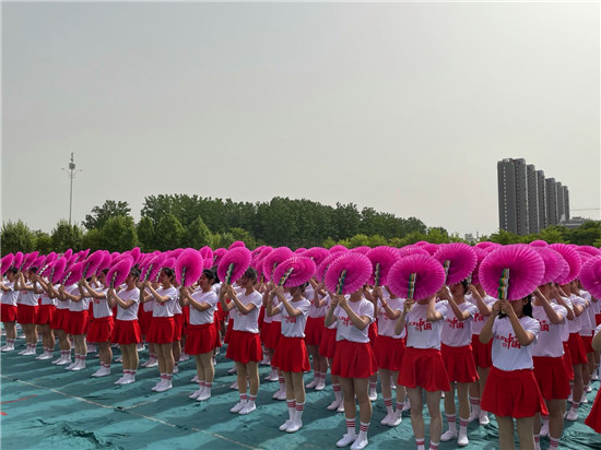 開(kāi)幕式還舉行了彩扇舞、啦啦操、中國(guó)功夫、歌曲等文體表演。其中,彩扇舞《盛世花開(kāi)》,由該校文化教育學(xué)院300名女生手持彩扇,跟隨著不同的音樂(lè)節(jié)奏變換著不同的色彩與隊(duì)形,依次拼出由鐮刀和錘頭組成的中國(guó)共產(chǎn)黨黨徽、象征體育精神的奧運(yùn)五環(huán)、“慶祝建黨100周年”、“周職20周年校慶”等圖形和字樣,表達(dá)著對(duì)黨的熱愛(ài)和對(duì)學(xué)校的祝福。表演者王真真說(shuō):“大家協(xié)同配合才能把節(jié)目表演好,這個(gè)節(jié)目我們排練了一個(gè)多月。雖然很辛苦,但是看到節(jié)目順利演出,感到很有成就感?!?/p>