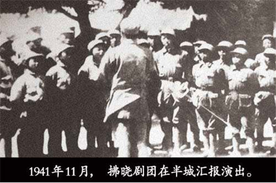 1938年深秋,劇團(tuán)到泌陽縣鄧莊鋪演出,群眾自動(dòng)地找木棍、找門板、挖土埋柱子,很快搭起一座戲臺(tái),掛上幕布,點(diǎn)燃油燈,男女老少坐在戲臺(tái)前的空地上。戲臺(tái)上先是演員們合唱抗日歌曲《新四軍軍歌》《游擊隊(duì)歌》《到敵人后方去》等,后演出話劇《突擊》。當(dāng)劇中的老爺爺抱著被日寇殺死的孩子,含淚控訴敵人的暴行時(shí),臺(tái)下的觀眾禁不住地憤怒高呼:“打倒日本帝國主義!把日本鬼子趕出中國!”1939年11月初,徐海東隨劉少奇由竹溝到華中路過新興集,彭雪楓命拂曉劇團(tuán)組織一個(gè)晚會(huì),以示熱烈歡迎。拂曉劇團(tuán)接受任務(wù)后,大家爭(zhēng)分奪秒,只用了一天時(shí)間,就集體創(chuàng)作排練出京劇《徐海東粉碎日寇“掃蕩”》,第二天就在歡迎晚會(huì)上演出。
