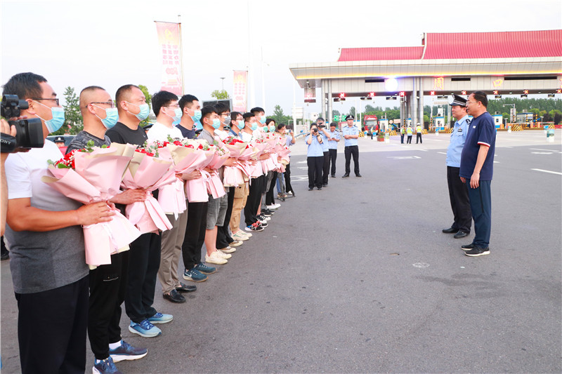 當日19時許,示范區(qū)二級調研員丁有亮,示范區(qū)公安分局黨委書記、局長何學民等同志前往迎接,歡迎勝利歸來的抓捕民警。當抓捕組車輛駛出高速路口時,現(xiàn)場響起熱烈的掌聲。丁有亮、何學民與參戰(zhàn)民警一一親切握手,對凱旋的民警表示歡迎和祝賀,民警代表將象征勝利和榮譽的鮮花獻給抓捕組民警。丁有亮表示向不辱使命、不畏艱險、勇打勝仗的參戰(zhàn)民警表示慰問,并要求他們把握戰(zhàn)機,繼續(xù)擴大戰(zhàn)果,再接再厲,再立新功。何學民指出,示范區(qū)公安分局將乘勢而上、提振士氣,縱深開展“迅雷”行動,出重拳打擊電信詐騙犯罪行為。