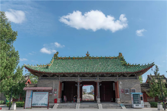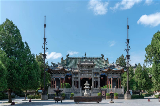 整個(gè)古建筑群為仿宮殿式,山門、鐵旗桿、石牌坊、碑亭、饗殿、大殿、河伯殿、炎帝殿、戲樓、拜殿、春秋閣由南向北,建于中軸線上,藥王殿、灶君殿和東廊房,財(cái)神殿、酒仙殿及西廊房在前院左右,東西看樓、東西配殿建在中院兩側(cè),老君殿、馬王殿、瘟神殿為東偏房,客房僧舍位于西院。是全國重點(diǎn)文物保護(hù)單位,國家AAAA級(jí)旅游景區(qū),國家三級(jí)博物館。