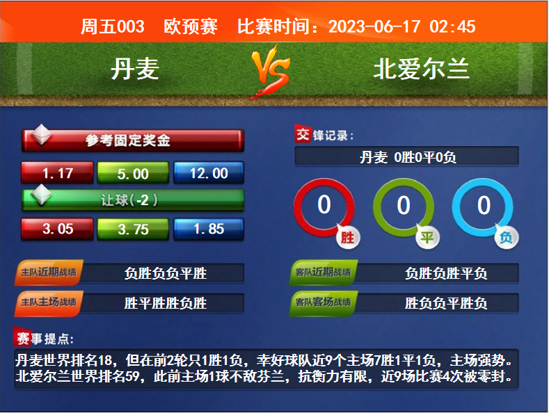 比賽時間:2023-06-17 02:45賽事提點(diǎn):丹麥?zhǔn)澜缗琶?8,但在前2輪只1勝1負(fù),幸好球隊(duì)近9個主場7勝1平1負(fù),主場強(qiáng)勢。北愛爾蘭世界排名59,此前主場1球不敵芬蘭,抗衡力有限,近9場比賽4次被零封。
