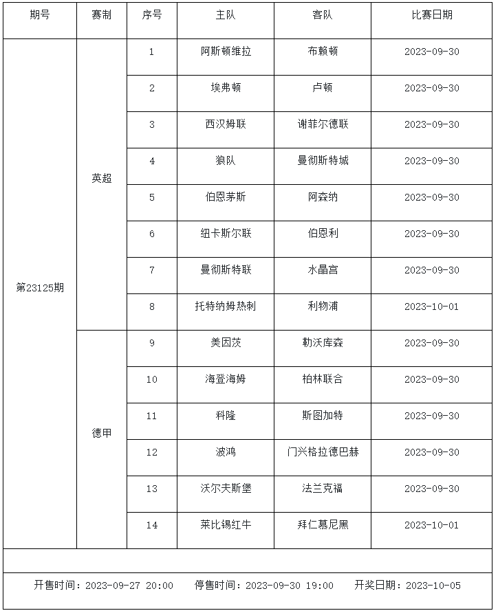 萊比錫周中德國杯3:2擊敗韋恩,各項賽事取得6連勝,出色的防守能力是萊比錫在今夏大失血之后依舊能保持競爭力的關鍵。在德甲賽季初的5場比賽里萊比錫打進14球僅失4球,是目前德甲失球最少的球隊之一,以亨利西斯+西馬坎+盧科巴+勞姆的后防組合功不可沒。拜仁上輪聯(lián)賽7:0血洗波鴻,凱恩上演帽子戲法,目前打進7球排在德甲射手榜第2的位置。目前隊內主力前腰穆西亞拉因傷無法出戰(zhàn),舒波莫廷替代他的位置,和科曼、薩內以及凱恩梳理球隊攻擊線,球隊的替補席上還有穆勒、格雷茨卡和格拉布里等眾多進攻好手,球隊主帥圖赫爾能夠打出的牌還有不少。兩支球隊在本賽季初的德國超級杯中有過交手,當時拜仁以0:3的比分不敵萊比錫,當時凱恩還未加入球隊,并非最強陣容出戰(zhàn),經歷了多場比賽的磨合之后,拜仁有信心能夠復仇對手全身而退。足球彩票勝負游戲(14場和任選9場)第23125期賽程: