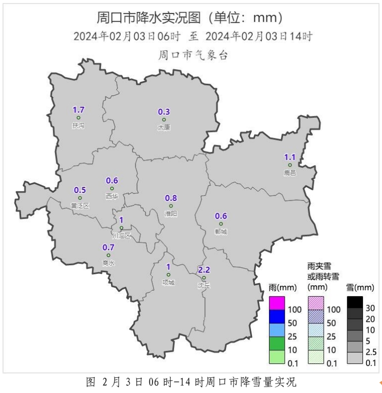 今天 06 時(shí)﹣14時(shí):我市出現(xiàn)小雪。最大降雪量出現(xiàn)在沈丘2.2毫米。各國家站降雪量(毫米):沈丘2.2、扶溝1.7、鹿邑1.1、項(xiàng)城 1.0、川匯區(qū) 1.0、淮陽0.8、商水0.7、鄲城0.6、西華0.6、黃泛區(qū)0.5、太康0.3。