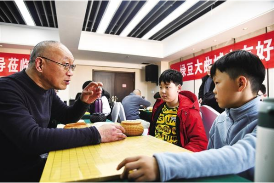 11月22日上午,一位老棋手同時對弈兩個娃娃棋手,幫助娃娃們提高棋藝。當(dāng)日,在河南省圍棋協(xié)會的支持下,由周口市圍棋協(xié)會主辦的“鄭州、南陽、周口三市圍棋交流賽”在周口舉行。