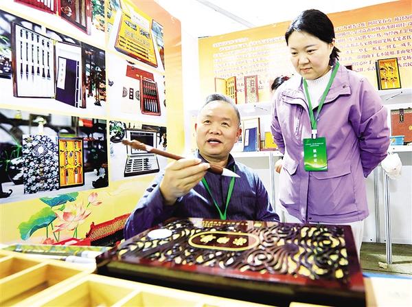 3月1日,在淮陽伏羲文化廣場(chǎng)非遺展示大廳,省級(jí)非物質(zhì)文化遺產(chǎn)代表性項(xiàng)目汝陽劉毛筆——御筆坊第67代制筆傳承人劉愛華(右)和父親劉好奎展示毛筆新品。